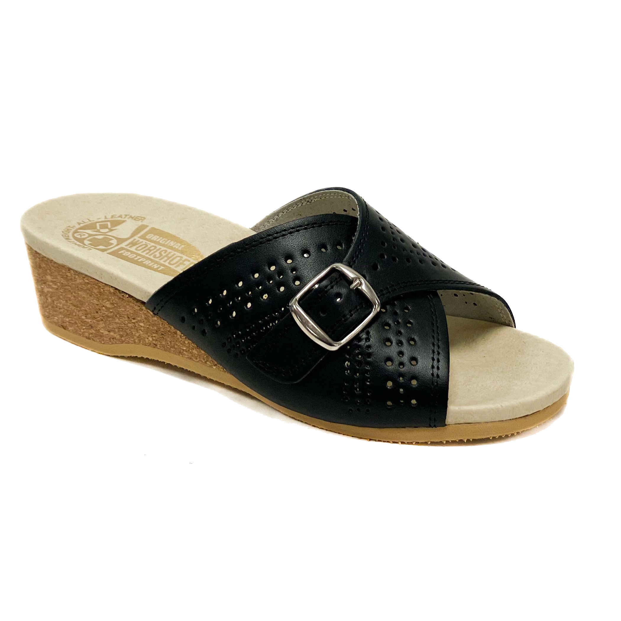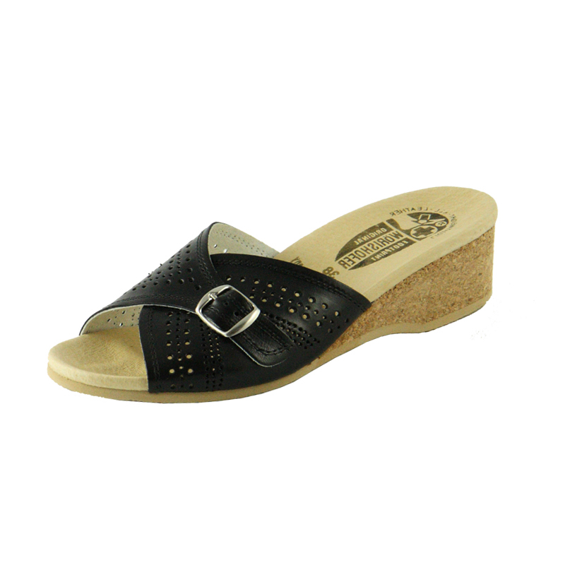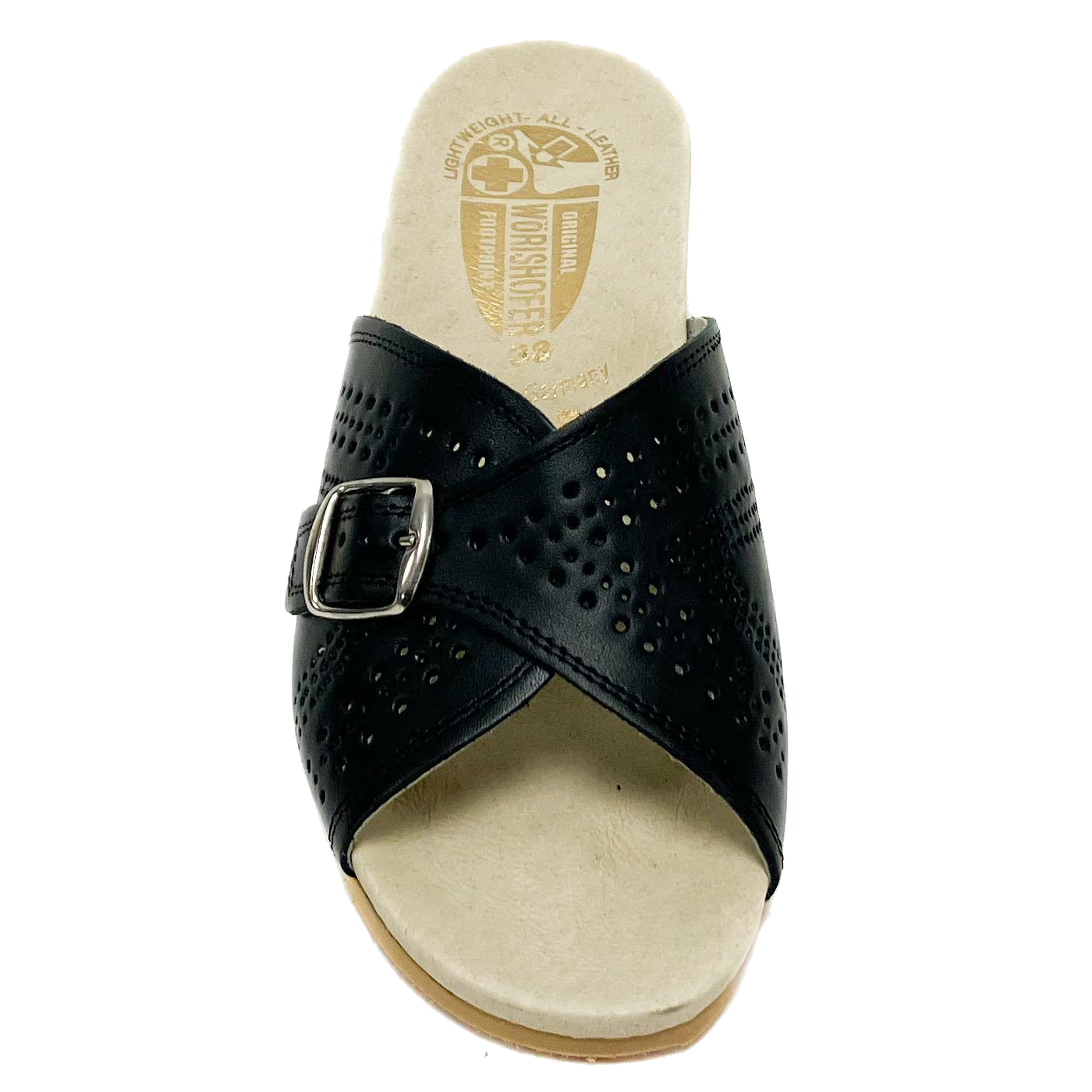 Découvrez les sandales classiques Wörishofer 251, à enfiler, coloris noir perforé.