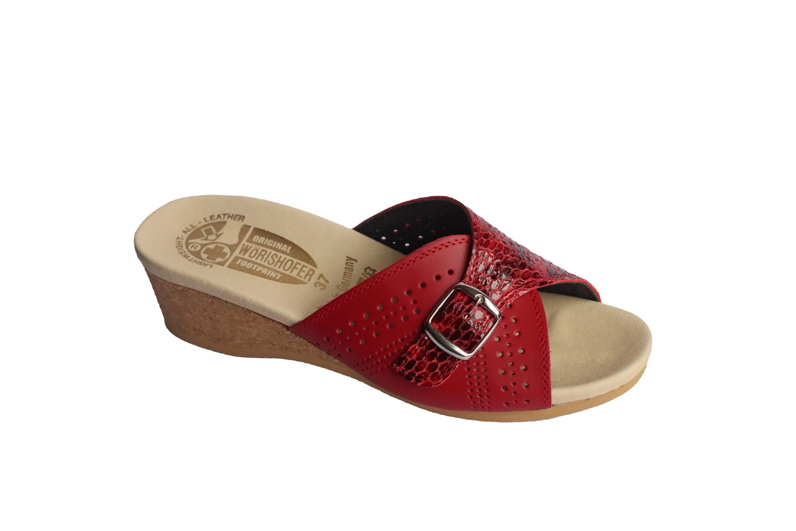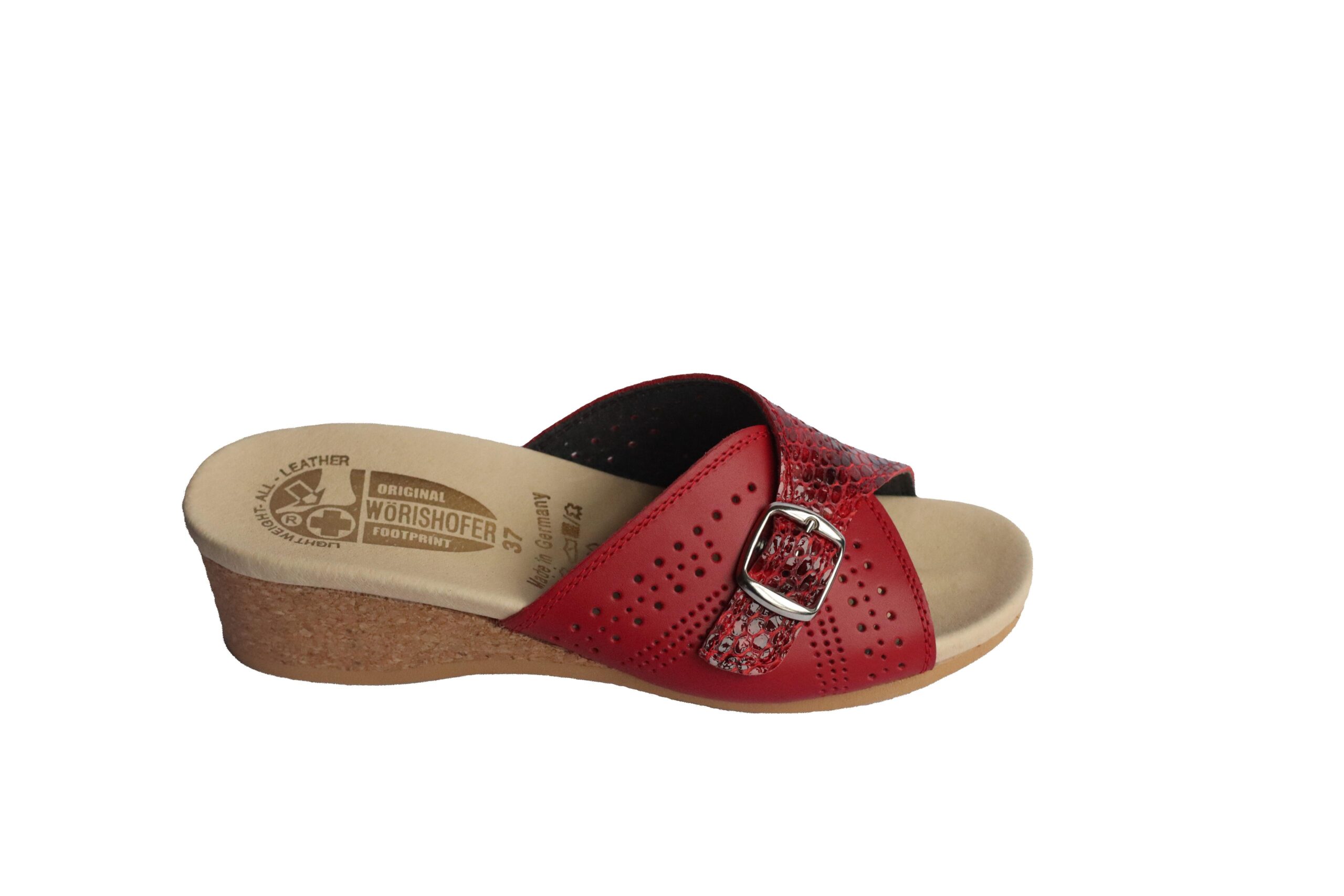 Découvrez les sandales classiques Wörishofer 251, à enfiler, coloris rouge serpent perforé.